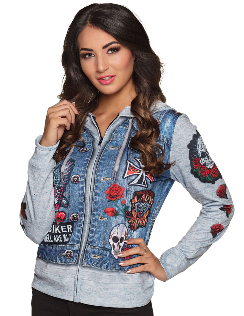 Sweat pour homme et femme il donne l'illusion de porter une veste en jean sans manches avec des écussons par dessus un sweat-shirt à capuche gris. La veste se ferme sur l'avant avec une fermeture à glissière.